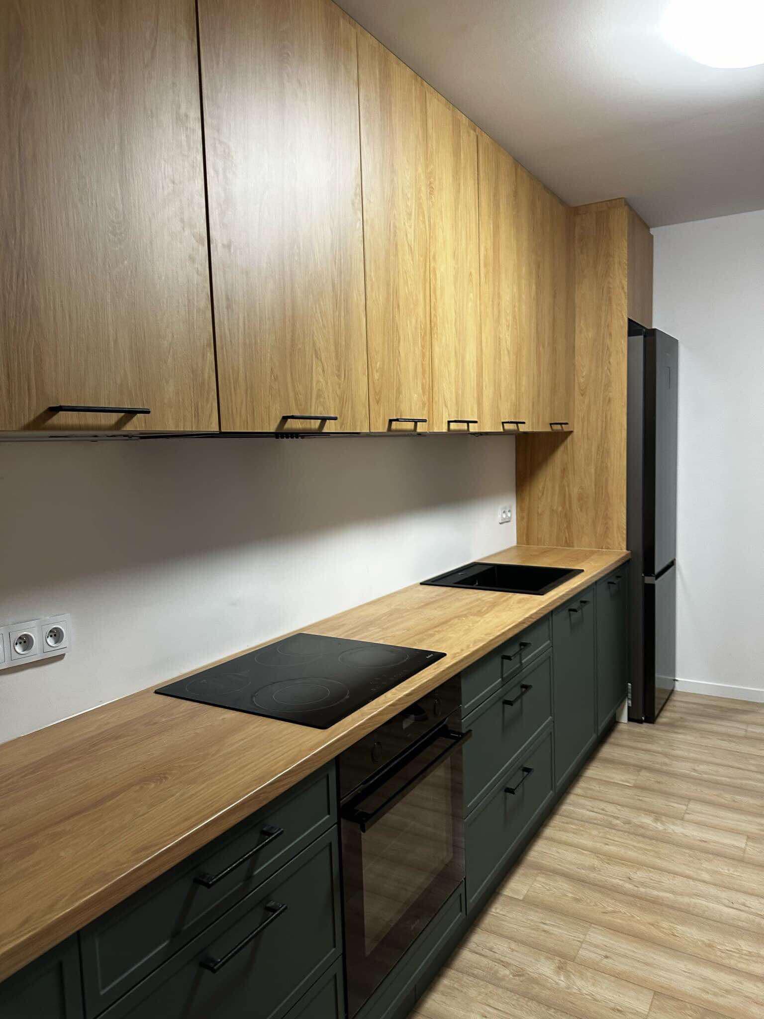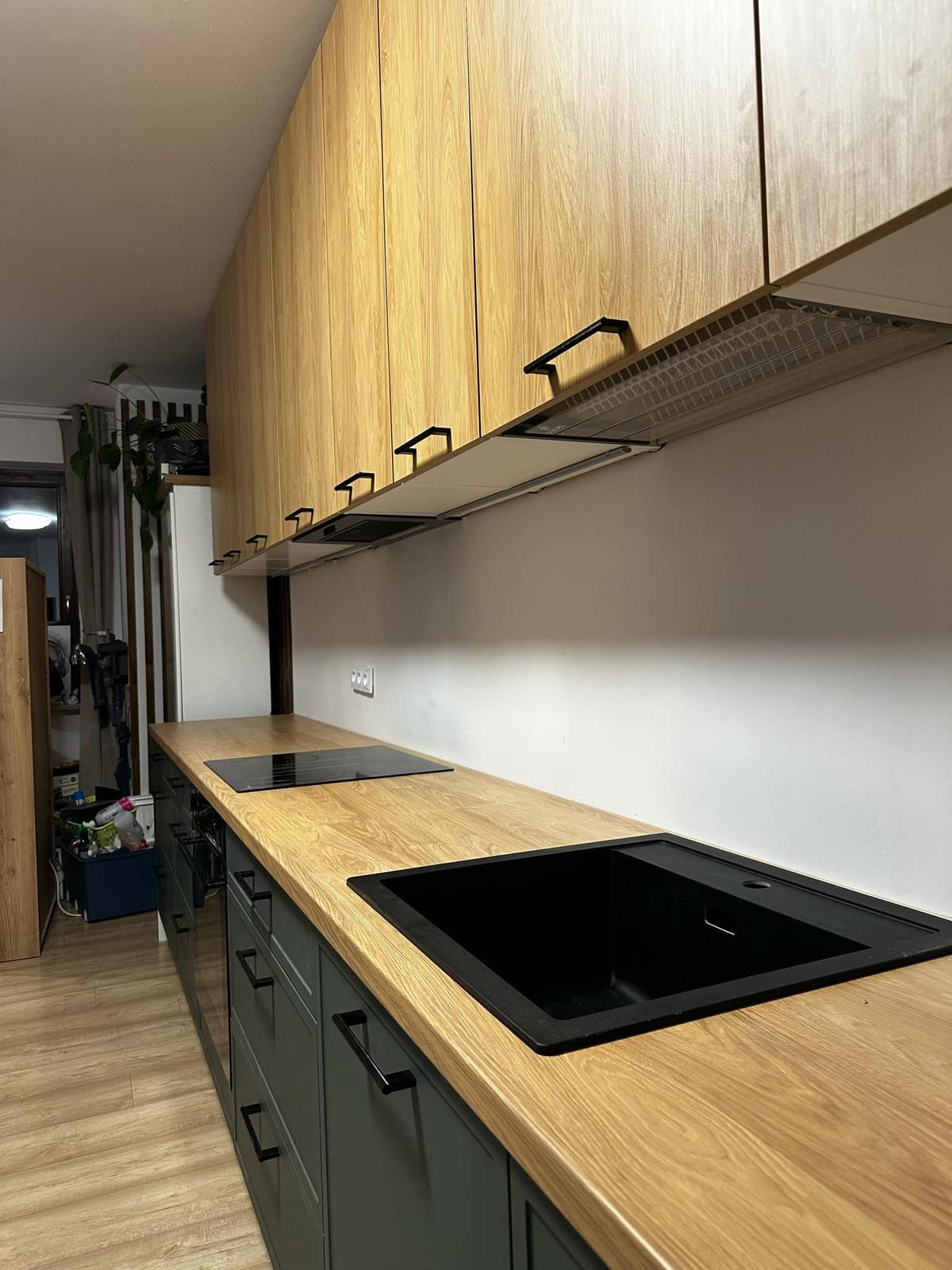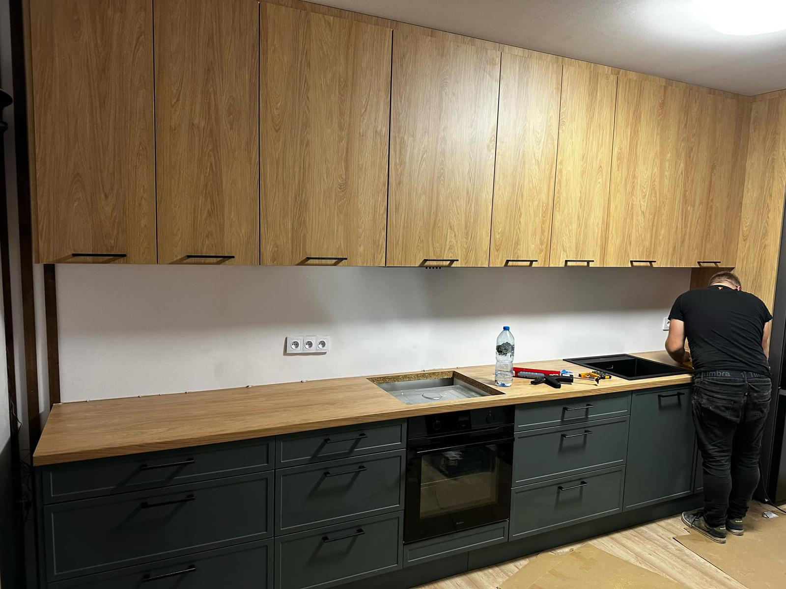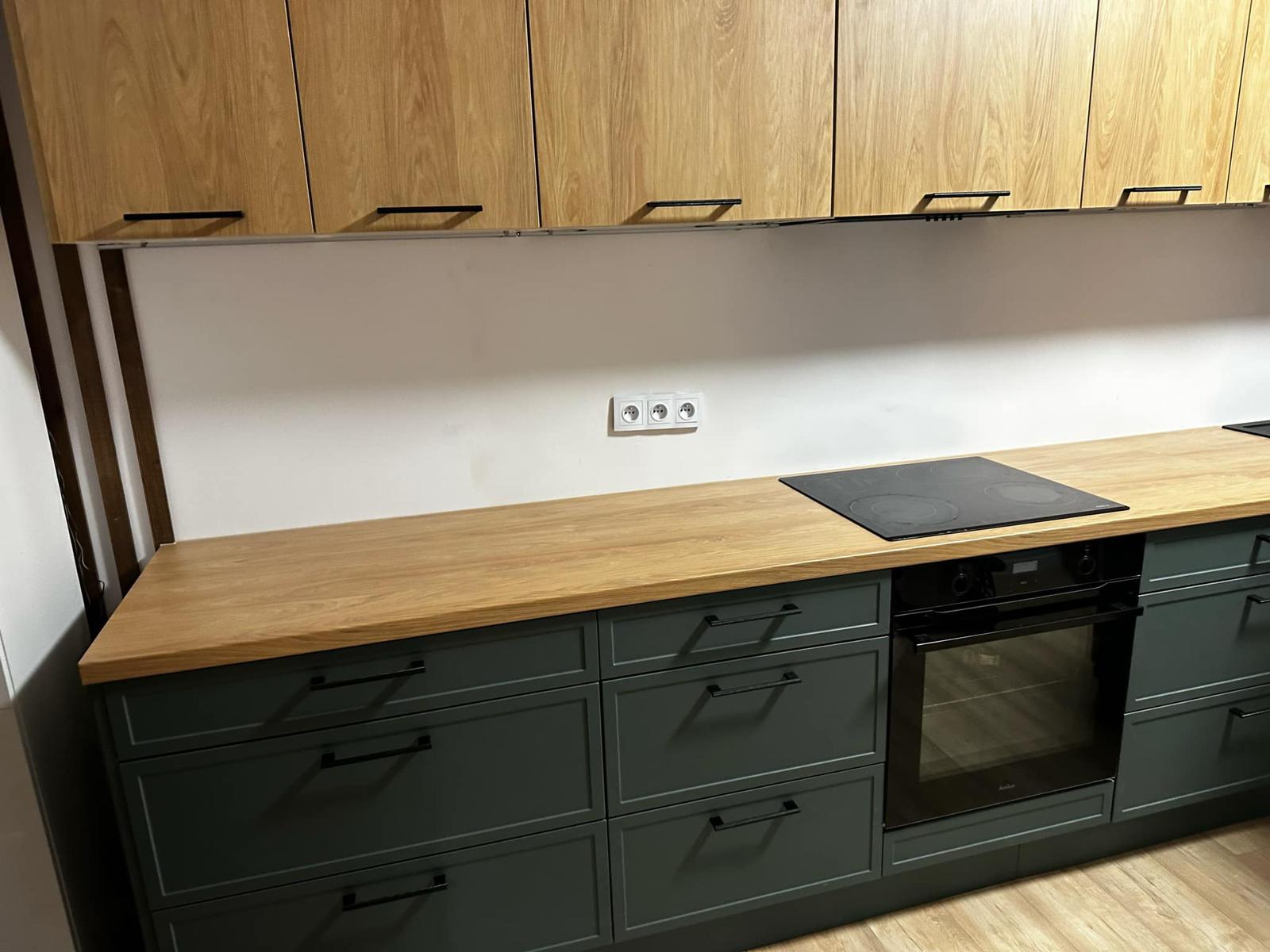 Fronty górne: EGGER - Hikora NaturalnaFronty dolne (ELIN): - Folia PVC - frezowane (ramka) - Dark GreenBlat: EGGER - Hikora NaturalnaProwadnice: STARMOTION - cichy domyk - dożywotnia gwarancjaUchwyty: V2Oświetlenie: LED - na całą długość szafek wiszących